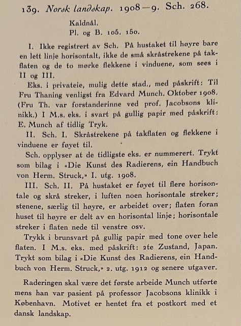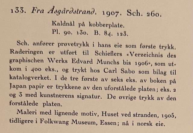 "Fra Åsgårdstrand" (Kat. 133) og "Norsk Landskap (Kat.139-III) er fra den originale Edvard Munch kunstmappe-utgivelsen "Etchings", som ble trykket i 1950, og utgitt i samarbeid med Sigurd Willoch (direktør for Nasjonalgalleriet frem til 1973), Johan H. Langaard (leder for Oslo kommunes kunstsamlinger frem til 1965) og forelegger Johan G. Tanum. Trykkene ble laget som en 1:1 utgivelse med referanse til Edvard Munchs originale etsningsplater, og ble trykket hos J. Chr. Gundersen i 1950. Papiret ble spesialprodusert av Saugbruksforeningen i Halden.