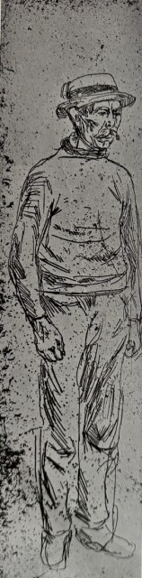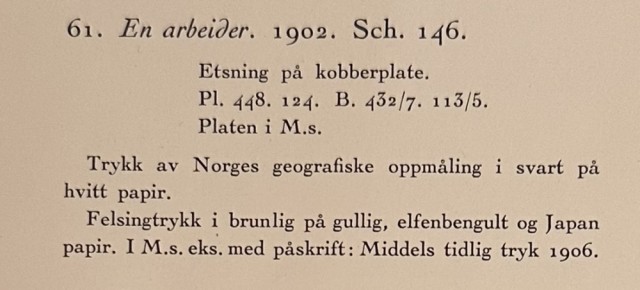 "En arbeider" (Kat. 61) er fra den originale Edvard Munch kunstmappe-utgivelsen "Etchings", som ble trykket i 1950, og utgitt i samarbeid med Sigurd Willoch (direktør for Nasjonalgalleriet frem til 1973), Johan H. Langaard (leder for Oslo kommunes kunstsamlinger frem til 1965) og forelegger Johan G. Tanum. Trykkene ble laget som en 1:1 utgivelse med referanse til Edvard Munchs originale etsningsplater, og ble trykket hos J. Chr. Gundersen i 1950. Papiret ble spesialprodusert av Saugbruksforeningen i Halden.
