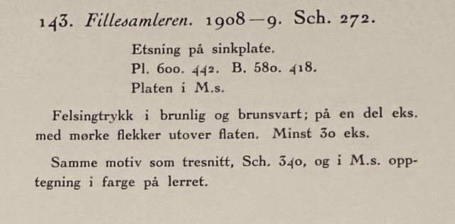 "Fillesamleren" (Kat. 143) er fra den originale Edvard Munch kunstmappe-utgivelsen "Etchings", som ble trykket i 1950, og utgitt i samarbeid med Sigurd Willoch (direktør for Nasjonalgalleriet frem til 1973), Johan H. Langaard (leder for Oslo kommunes kunstsamlinger frem til 1965) og forelegger Johan G. Tanum. Trykkene ble laget som en 1:1 utgivelse med referanse til Edvard Munchs originale etsningsplater, og ble trykket hos J. Chr. Gundersen i 1950. Papiret ble spesialprodusert av Saugbruksforeningen i Halden.