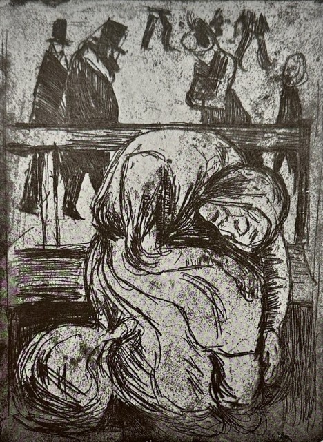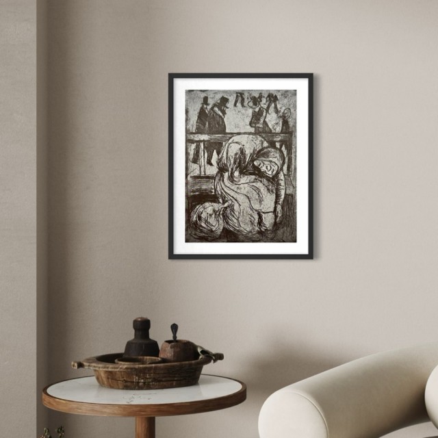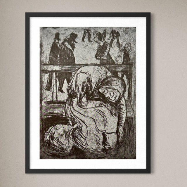 "Gammel kone på en benk" (Kat. 67) er fra den originale Edvard Munch kunstmappe-utgivelsen "Etchings", som ble trykket i 1950, og utgitt i samarbeid med Sigurd Willoch (direktør for Nasjonalgalleriet frem til 1973), Johan H. Langaard (leder for Oslo kommunes kunstsamlinger frem til 1965) og forelegger Johan G. Tanum. Trykkene ble laget som en 1:1 utgivelse med referanse til Edvard Munchs originale etsningsplater, og ble trykket hos J. Chr. Gundersen i 1950. Papiret ble spesialprodusert av Saugbruksforeningen i Halden.