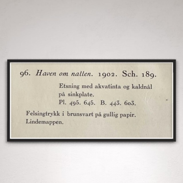 "Haven om natten" (Kat. 96) er fra den originale Edvard Munch kunstmappe-utgivelsen "Etchings", som ble trykket i 1950, og utgitt i samarbeid med Sigurd Willoch (direktør for Nasjonalgalleriet frem til 1973), Johan H. Langaard (leder for Oslo kommunes kunstsamlinger frem til 1965) og forelegger Johan G. Tanum. Trykkene ble laget som en 1:1 utgivelse med referanse til Edvard Munchs originale etsningsplater, og ble trykket hos J. Chr. Gundersen i 1950. Papiret ble spesialprodusert av Saugbruksforeningen i Halden.