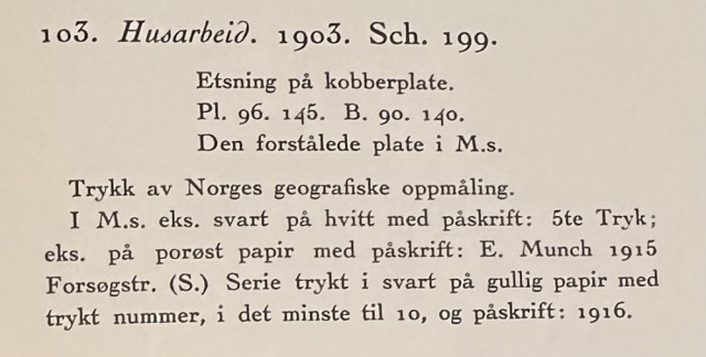 "Husarbeide" (Kat. 103) er fra den originale Edvard Munch kunstmappe-utgivelsen "Etchings", som ble trykket i 1950, og utgitt i samarbeid med Sigurd Willoch (direktør for Nasjonalgalleriet frem til 1973), Johan H. Langaard (leder for Oslo kommunes kunstsamlinger frem til 1965) og forelegger Johan G. Tanum. Trykkene ble laget som en 1:1 utgivelse med referanse til Edvard Munchs originale etsningsplater, og ble trykket hos J. Chr. Gundersen i 1950. Papiret ble spesialprodusert av Saugbruksforeningen i Halden.