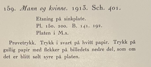 "Mann og kvinne" (Kat. 159) er fra den originale Edvard Munch kunstmappe-utgivelsen "Etchings", som ble trykket i 1950, og utgitt i samarbeid med Sigurd Willoch (direktør for Nasjonalgalleriet frem til 1973), Johan H. Langaard (leder for Oslo kommunes kunstsamlinger frem til 1965) og forelegger Johan G. Tanum. Trykkene ble laget som en 1:1 utgivelse med referanse til Edvard Munchs originale etsningsplater, og ble trykket hos J. Chr. Gundersen i 1950. Papiret ble spesialprodusert av Saugbruksforeningen i Halden.
