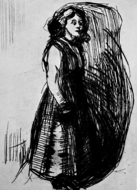 "Stående ung pike" (Kat. 189) er fra den originale Edvard Munch kunstmappe-utgivelsen "Etchings", som ble trykket i 1950, og utgitt i samarbeid med Sigurd Willoch (direktør for Nasjonalgalleriet frem til 1973), Johan H. Langaard (leder for Oslo kommunes kunstsamlinger frem til 1965) og forelegger Johan G. Tanum. Trykkene ble laget som en 1:1 utgivelse med referanse til Edvard Munchs originale etsningsplater, og ble trykket hos J. Chr. Gundersen i 1950. Papiret ble spesialprodusert av Saugbruksforeningen i Halden.
