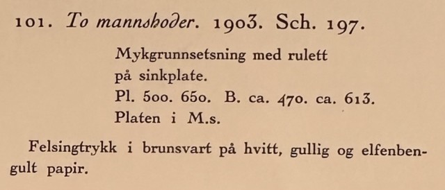 "To mannshoder" (Kat. 101) er fra den originale Edvard Munch kunstmappe-utgivelsen "Etchings", som ble trykket i 1950, og utgitt i samarbeid med Sigurd Willoch (direktør for Nasjonalgalleriet frem til 1973), Johan H. Langaard (leder for Oslo kommunes kunstsamlinger frem til 1965) og forelegger Johan G. Tanum. Trykkene ble laget som en 1:1 utgivelse med referanse til Edvard Munchs originale etsningsplater, og ble trykket hos J. Chr. Gundersen i 1950. Papiret ble spesialprodusert av Saugbruksforeningen i Halden.