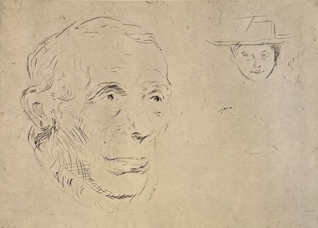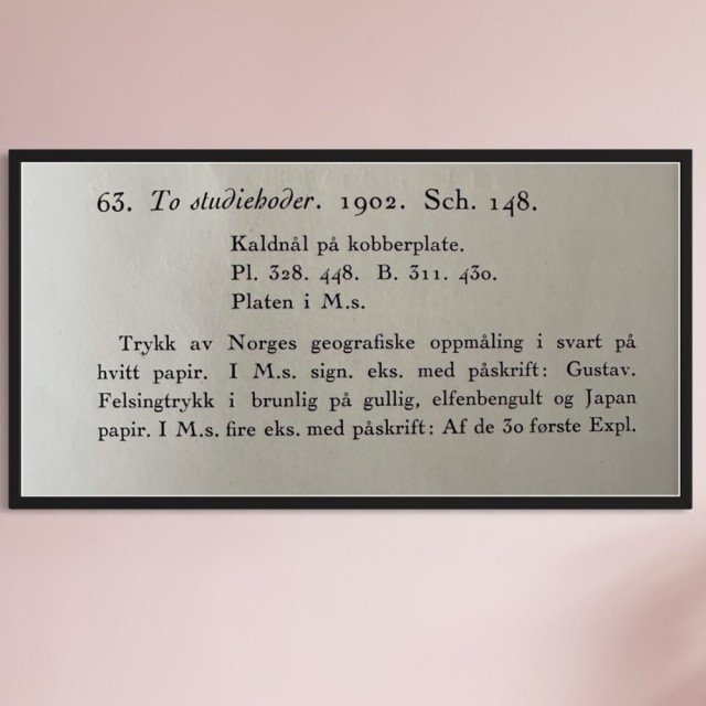 "To studiehoder" (Kat.63) er fra den originale Edvard Munch kunstmappe-utgivelsen "Etchings", som ble trykket i 1950, og utgitt i samarbeid med Sigurd Willoch (direktør for Nasjonalgalleriet frem til 1973), Johan H. Langaard (leder for Oslo kommunes kunstsamlinger frem til 1965) og forelegger Johan G. Tanum. Trykkene ble laget som en 1:1 utgivelse med referanse til Edvard Munchs originale etsningsplater, og ble trykket hos J. Chr. Gundersen i 1950. Papiret ble spesialprodusert av Saugbruksforeningen i Halden.