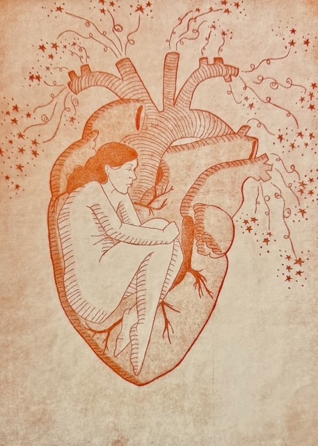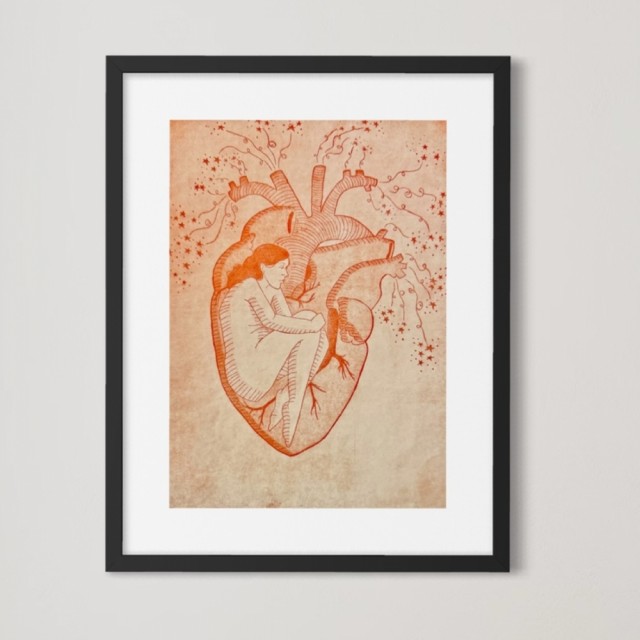 "Hjertet utenfor kroppen" er et nummerert og signert, håndkolorert giclee trykk fra Maud Angelica Behn. Opplag 45. Prisen er inkludert 5% Bkh og selges på vegne av kunstneren. Arkmål er 42 x 59 cm.