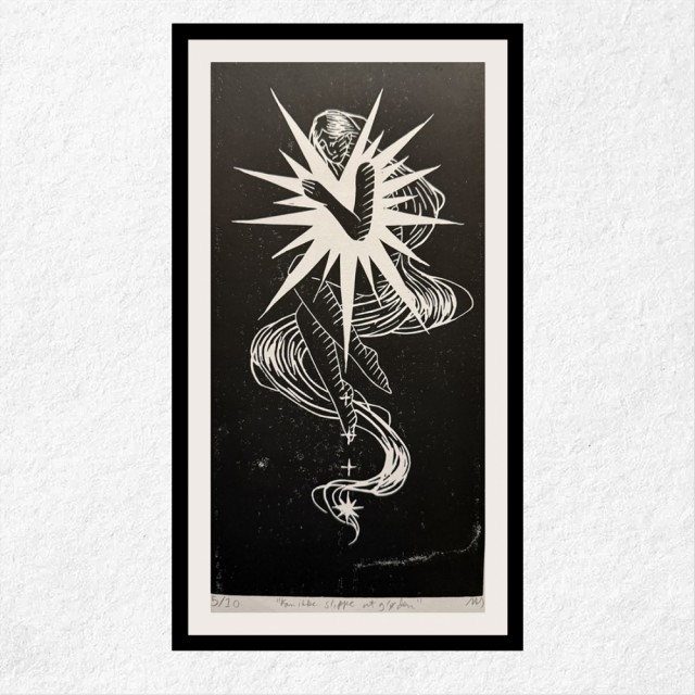 Nummerert og signert linotrykk av Maud Angelica Behn. Opplag 10. Mål uten ramme er 29,5 x 42 cm. Selges på vegne av kunstneren.