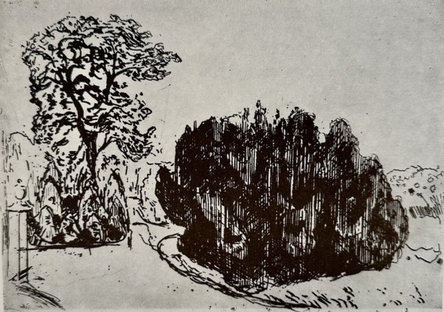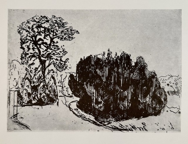 "Aften i parken" (Kat. 98) er fra den originale Edvard Munch kunstmappe-utgivelsen "Etchings", som ble trykket i 1950, og utgitt i samarbeid med Sigurd Willoch (direktør for Nasjonalgalleriet frem til 1973), Johan H. Langaard (leder for Oslo kommunes kunstsamlinger frem til 1965) og forelegger Johan G. Tanum. Trykkene ble laget som en 1:1 utgivelse med referanse til Edvard Munchs originale etsningsplater, og ble trykket hos J. Chr. Gundersen i 1950. Papiret ble spesialprodusert av Saugbruksforeningen i Halden.