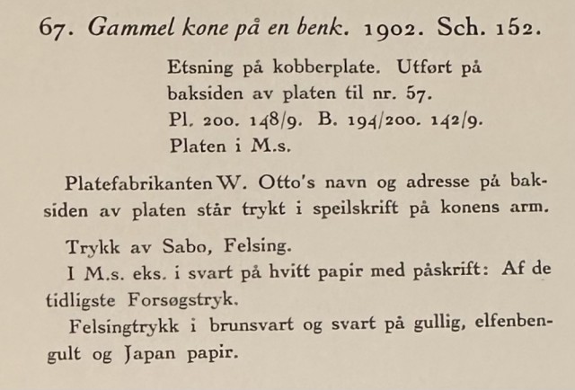 "Gammel kone på en benk" (Kat. 67) er fra den originale Edvard Munch kunstmappe-utgivelsen "Etchings", som ble trykket i 1950, og utgitt i samarbeid med Sigurd Willoch (direktør for Nasjonalgalleriet frem til 1973), Johan H. Langaard (leder for Oslo kommunes kunstsamlinger frem til 1965) og forelegger Johan G. Tanum. Trykkene ble laget som en 1:1 utgivelse med referanse til Edvard Munchs originale etsningsplater, og ble trykket hos J. Chr. Gundersen i 1950. Papiret ble spesialprodusert av Saugbruksforeningen i Halden.