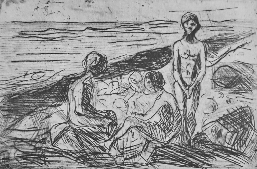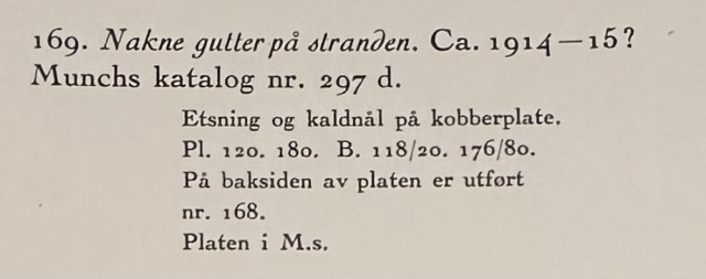 "Nakne gutter på stranden" (Kat. 169) er fra den originale Edvard Munch kunstmappe-utgivelsen "Etchings", som ble trykket i 1950, og utgitt i samarbeid med Sigurd Willoch (direktør for Nasjonalgalleriet frem til 1973), Johan H. Langaard (leder for Oslo kommunes kunstsamlinger frem til 1965) og forelegger Johan G. Tanum. Trykkene ble laget som en 1:1 utgivelse med referanse til Edvard Munchs originale etsningsplater, og ble trykket hos J. Chr. Gundersen i 1950. Papiret ble spesialprodusert av Saugbruksforeningen i Halden.