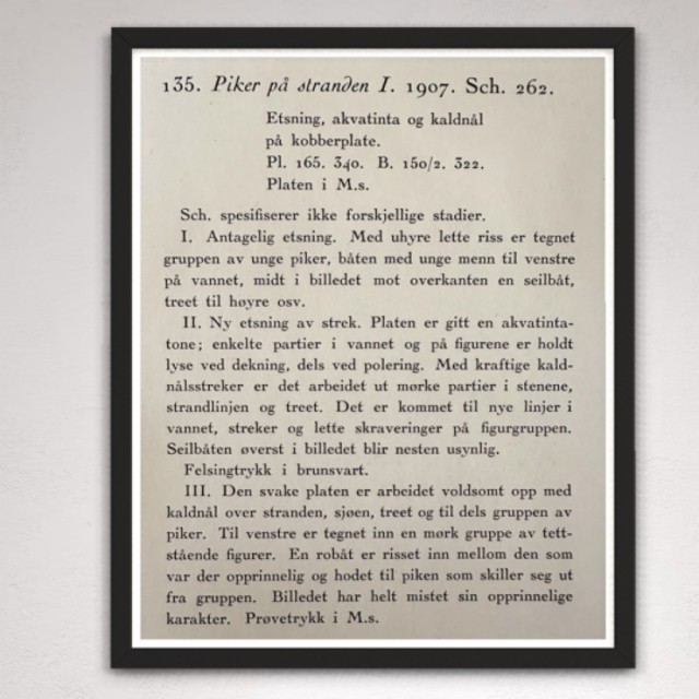 "Piker på stranden I" (Kat. 135-1) er fra den originale Edvard Munch kunstmappe-utgivelsen "Etchings", som ble trykket i 1950, og utgitt i samarbeid med Sigurd Willoch (direktør for Nasjonalgalleriet frem til 1973), Johan H. Langaard (leder for Oslo kommunes kunstsamlinger frem til 1965) og forelegger Johan G. Tanum. Trykkene ble laget som en 1:1 utgivelse med referanse til Edvard Munchs originale etsningsplater, og ble trykket hos J. Chr. Gundersen i 1950. Papiret ble spesialprodusert av Saugbruksforeningen i Halden.