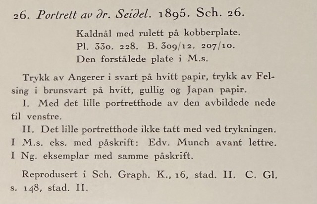 "Portrett av Dr. Seidel" (Kat. 26-1) er fra den originale Edvard Munch kunstmappe-utgivelsen "Etchings", som ble trykket i 1950, og utgitt i samarbeid med Sigurd Willoch (direktør for Nasjonalgalleriet frem til 1973), Johan H. Langaard (leder for Oslo kommunes kunstsamlinger frem til 1965) og forelegger Johan G. Tanum. Trykkene ble laget som en 1:1 utgivelse med referanse til Edvard Munchs originale etsningsplater, og ble trykket hos J. Chr. Gundersen i 1950. Papiret ble spesialprodusert av Saugbruksforeningen i Halden.