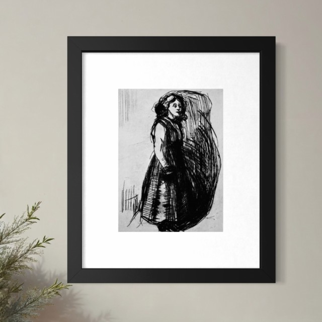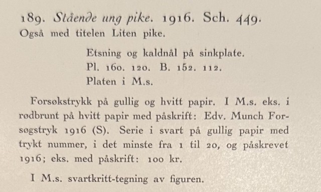 "Stående ung pike" (Kat. 189) er fra den originale Edvard Munch kunstmappe-utgivelsen "Etchings", som ble trykket i 1950, og utgitt i samarbeid med Sigurd Willoch (direktør for Nasjonalgalleriet frem til 1973), Johan H. Langaard (leder for Oslo kommunes kunstsamlinger frem til 1965) og forelegger Johan G. Tanum. Trykkene ble laget som en 1:1 utgivelse med referanse til Edvard Munchs originale etsningsplater, og ble trykket hos J. Chr. Gundersen i 1950. Papiret ble spesialprodusert av Saugbruksforeningen i Halden.