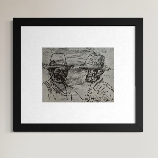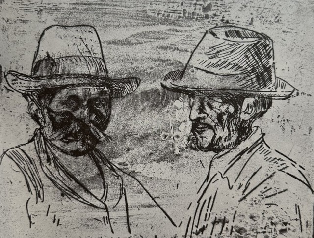 "To mannshoder" (Kat. 101) er fra den originale Edvard Munch kunstmappe-utgivelsen "Etchings", som ble trykket i 1950, og utgitt i samarbeid med Sigurd Willoch (direktør for Nasjonalgalleriet frem til 1973), Johan H. Langaard (leder for Oslo kommunes kunstsamlinger frem til 1965) og forelegger Johan G. Tanum. Trykkene ble laget som en 1:1 utgivelse med referanse til Edvard Munchs originale etsningsplater, og ble trykket hos J. Chr. Gundersen i 1950. Papiret ble spesialprodusert av Saugbruksforeningen i Halden.