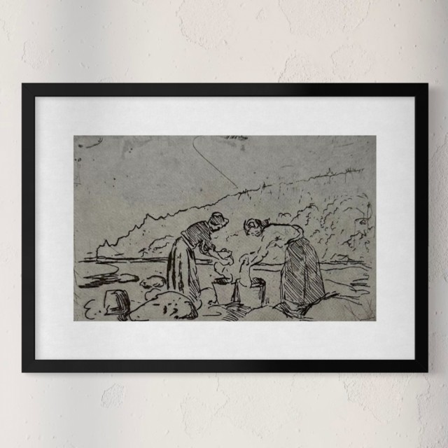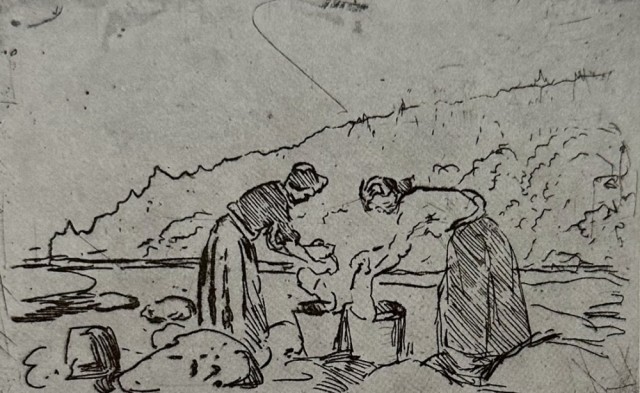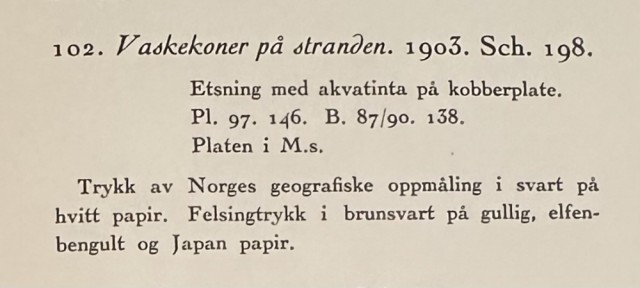 "Vaskekoner ved stranden" (Kat. 102) er fra den originale Edvard Munch kunstmappe-utgivelsen "Etchings", som ble trykket i 1950, og utgitt i samarbeid med Sigurd Willoch (direktør for Nasjonalgalleriet frem til 1973), Johan H. Langaard (leder for Oslo kommunes kunstsamlinger frem til 1965) og forelegger Johan G. Tanum. Trykkene ble laget som en 1:1 utgivelse med referanse til Edvard Munchs originale etsningsplater, og ble trykket hos J. Chr. Gundersen i 1950. Papiret ble spesialprodusert av Saugbruksforeningen i Halden.
