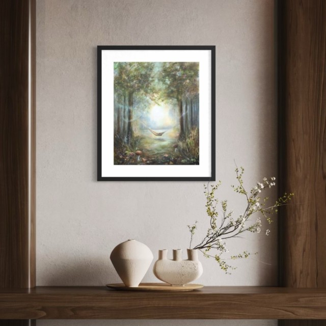 Ønsker du kunsten ferdig innrammet så blir totalprisen kr.5.850, rammes da inn med valgfri ramme, hvit syrefri passepartout, glass og oppheng. Mål med ramme er ca 50x65 cm.
