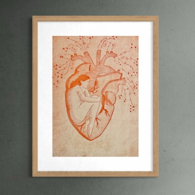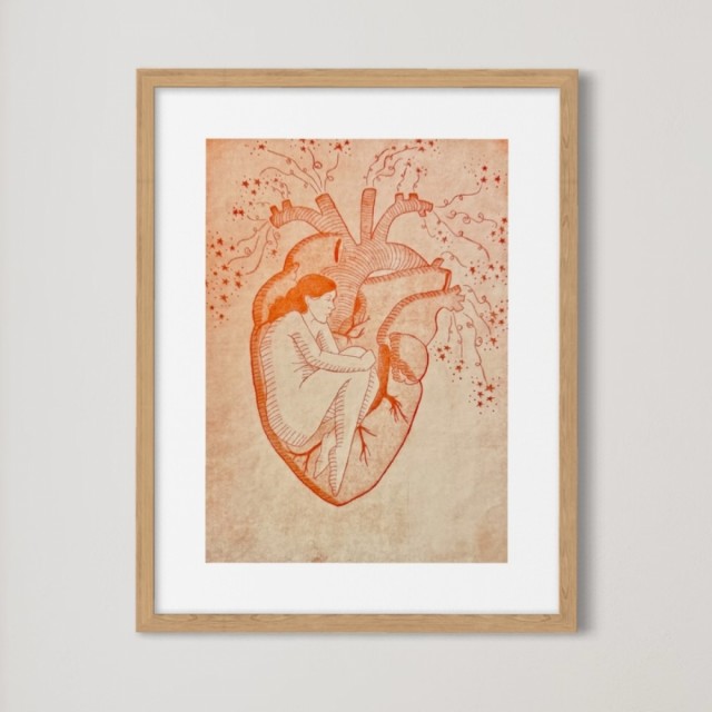 "Hjertet utenfor kroppen" er et nummerert og signert, håndkolorert giclee trykk fra Maud Angelica Behn. Opplag 45. Prisen er inkludert 5% Bkh og selges på vegne av kunstneren. Arkmål er 42 x 59 cm.