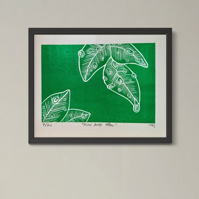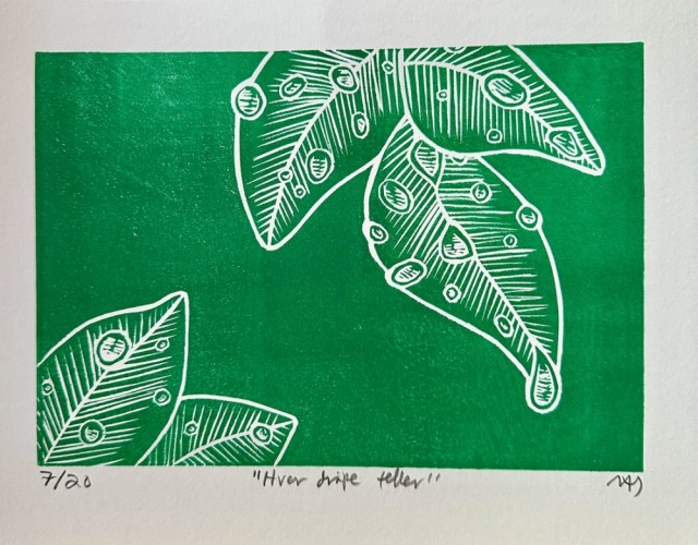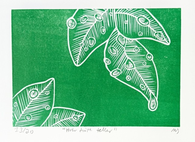 Sitat Maud: "Jeg har lyst til å gjøre en serie med små detaljer som jeg elsker med livet, og som kanskje kan være vanskelig å legge merke til. Som dråpene på blader. Og er det ikke det kunst skal hjelpe oss med? Med å minne oss om de små vakre detaljene av livet som kan være lett å ta forgitt? I disse bladene føler jeg også det handler om å nyte de sakte tingene i livet. Hverdagen kan gå så sykt raskt, og da er det viktig å nyte de sakte, kjedelige øyeblikkene. Jeg bestemte meg for å kalle bildet "Hver dråpe teller" for det handler om å nyte alle øyeblikkene i livet. At hver dråpe og øyeblikk teller. Og dråpene går "plopp plopp" som en klokke. Altså at de teller..."