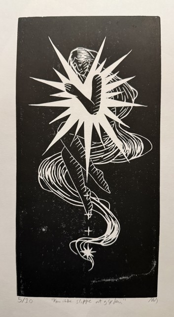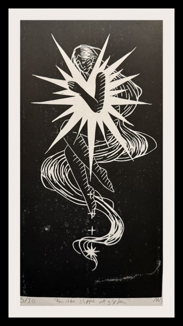 Nummerert og signert linotrykk av Maud Angelica Behn. Opplag 10. Mål uten ramme er 29,5 x 42 cm. Selges på vegne av kunstneren.