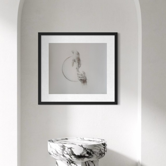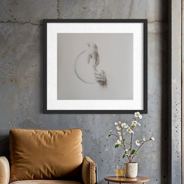 Ønsker du kunsten ferdig innrammet så blir totalprisen kr.8600. Rammes inn med valgfri ramme, artglass, hvit syrefri passepartout og oppheng. Mål ferdig innrammet er ca. 75x65 cm